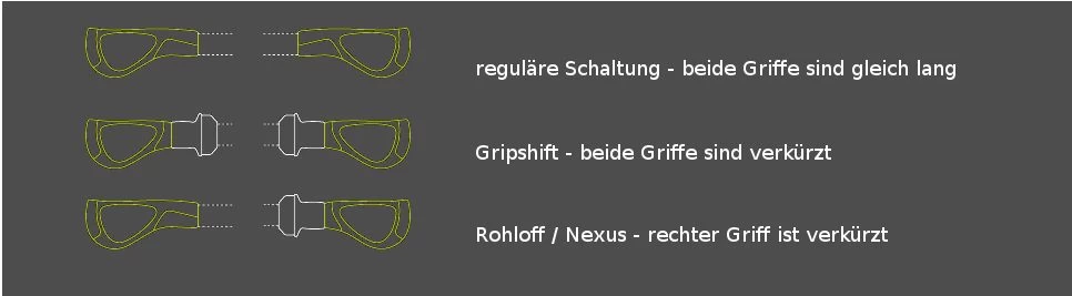 - Variantes (à choisir en option) : Regular: les deux poignées sont de la même longueur/ Rohloff® / Nexus®: poignée droite raccourcie/ Gripshift®: les deux poignées sont raccourcies
